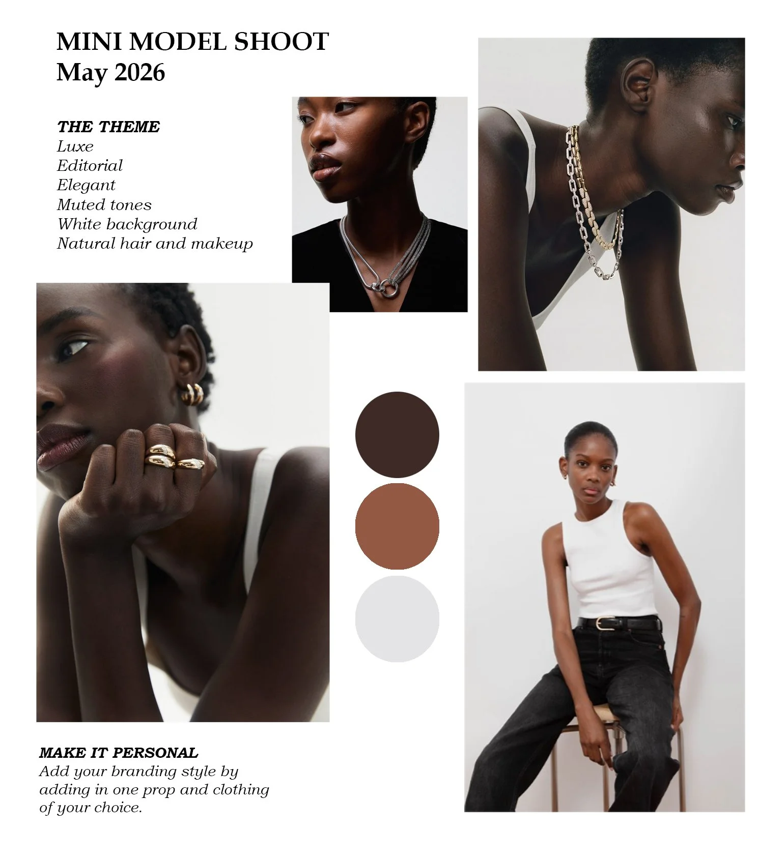 This month’s theme features a strong editorial feel with a white backdrop and directional lighting — creating the perfect blank canvas to make your jewellery the centre of attention. For a more personalised touch, you can add a prop and select your own choice of clothing to further reflect your brand.
